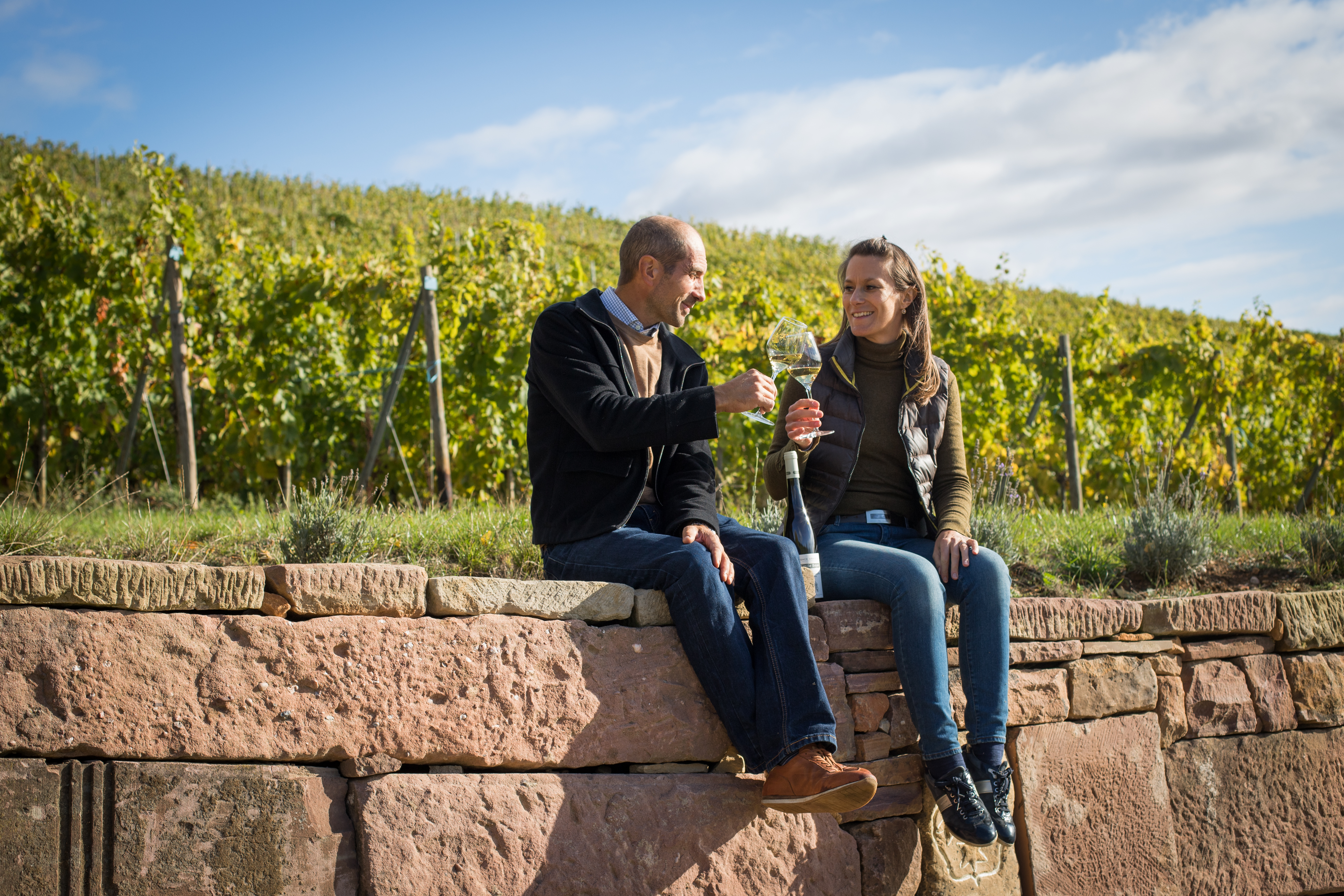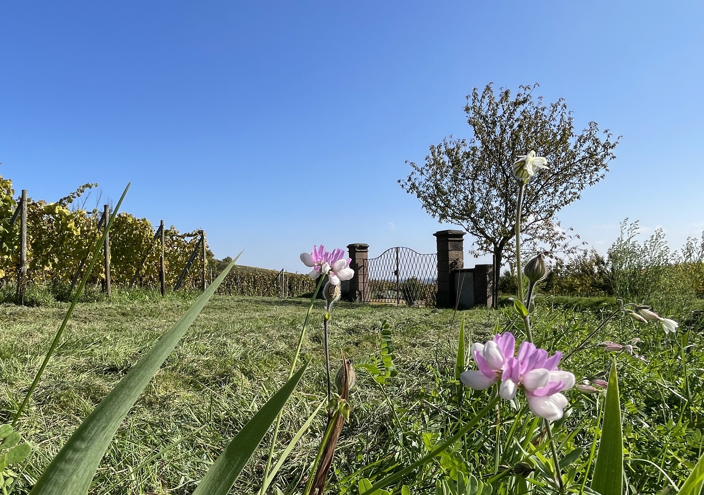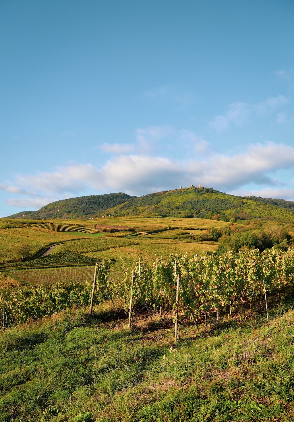 Les conditions géologiques et climatiques indispensables à la production d’un grand vin sont ici réunies. Ces facteurs naturels associés à une viticulture précise dans le respect des rythmes de la nature concourent à la production d’un vin à forte personnalité. Le choix des plants de vigne s’est porté tout naturellement sur le fleuron du vignoble alsacien ; le riesling sur 1.5 ha. Les plants de vigne sont issus de 12 variétés anciennes (sélection massale), plantés en densité élevée et choisis pour leur aptitude à une production de grande qualité. Sur la crête sommitale baignée de lumière, une faune et une flore aux affinités méditerranéennes orientent le choix vers le Pinot Noir sur 1 ha. Cet interprète du terroir en restitue les plus infimes variations et est à l’origine des plus grands vins rouges.